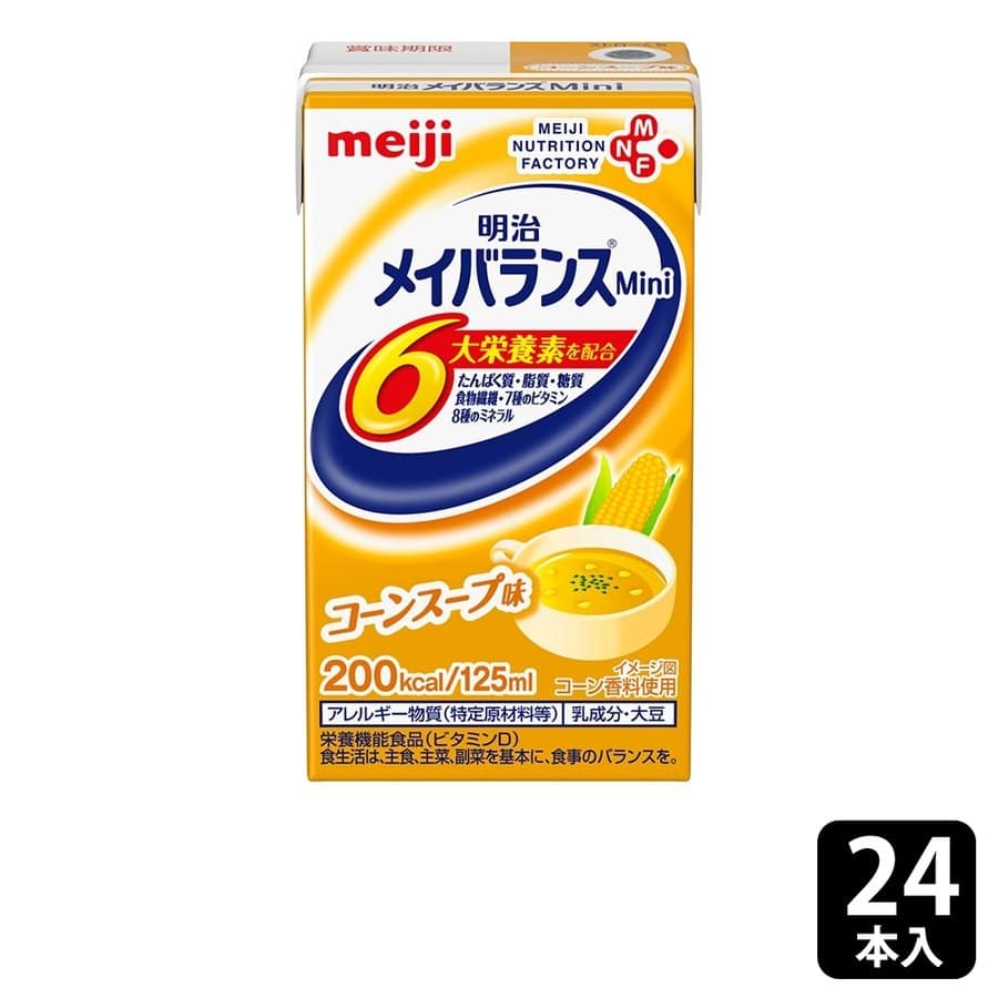 体に大切な栄養素(たんぱく質・脂質・糖質・食物繊維・7種のビタミン・8種のミネラル)が一度に摂れる!内容量 125ml×24本(コーンスープ味) 原材料 液状デキストリン(国内製造)、乳たんぱく質、食用油脂(なたね油、パーム分別油)、難消化性デキストリン、砂糖、食塩、酵母/カゼインNa、乳化剤、リン酸K、塩化K、クエン酸K、クエン酸Na、炭酸Mg、調味料(アミノ酸等)、香料、V.C、pH調整剤、グルコン酸亜鉛、V.E、硫酸鉄、クチナシ色素、ナイアシン、パントテン酸Ca、V.B6、グルコン酸銅、V.B1、V.B2、V.A、葉酸、V.B12、V.D、(一部に乳成分・大豆を含む) アレルゲン 乳成分・大豆 賞味期限・消費期限 製造日より270日 保存方法 常温保存