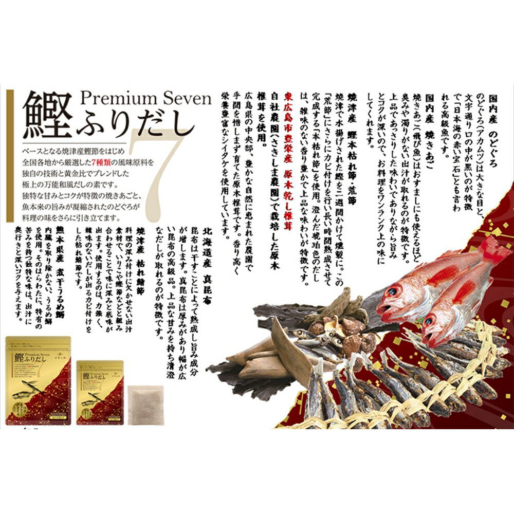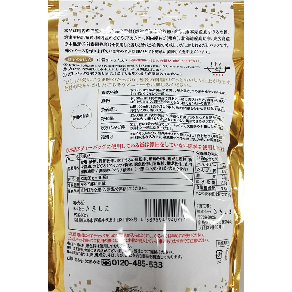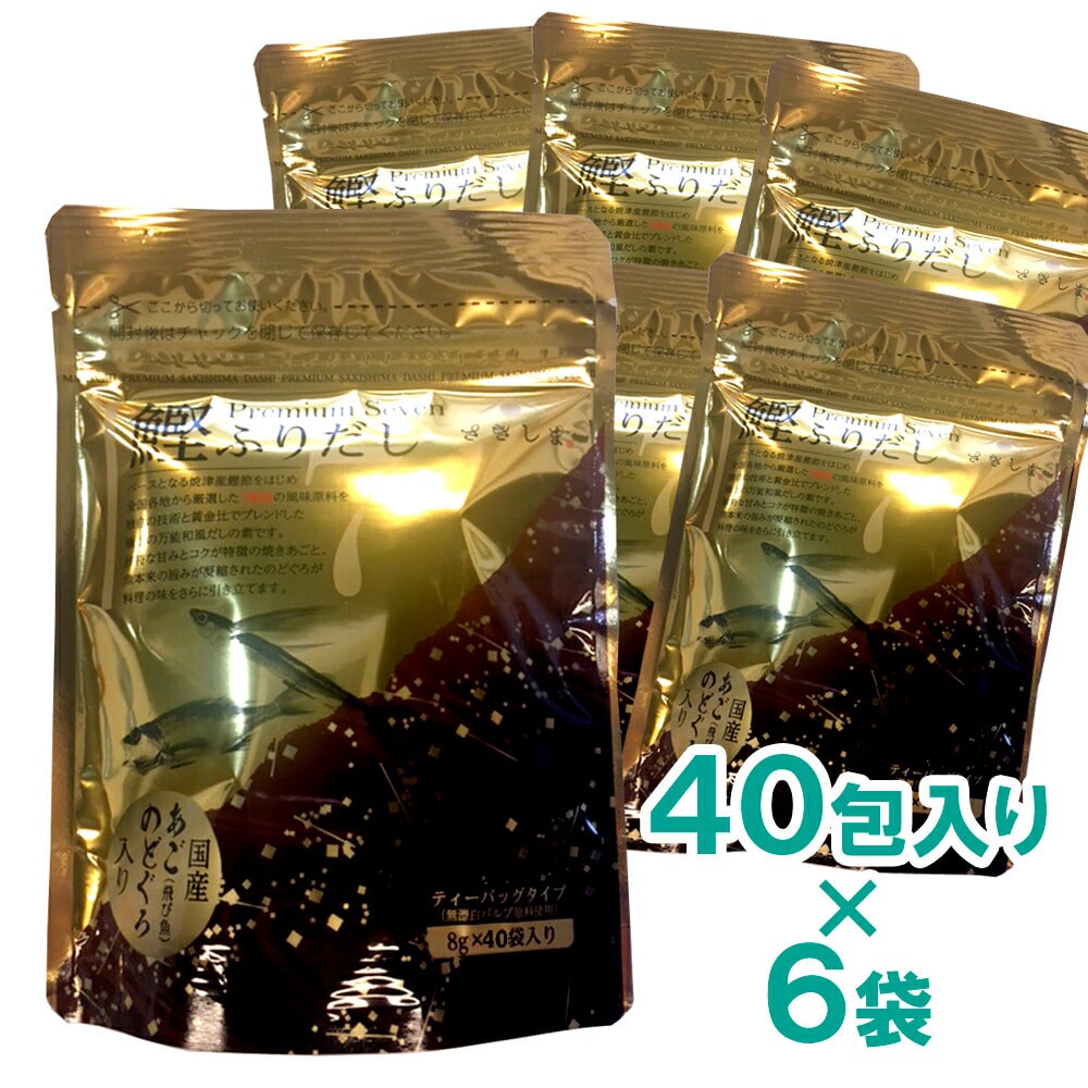 味のベースを作り上げていますので、お料理がとても簡単においしく出来上がります。内容量 8g×40包×6袋 原材料 食塩、砂糖、鰹節粉末、煮干うるめ鰯粉末、鰹だし顆粒、粉末醤油、のどぐろ(アカムツ)粉末、飛魚粉末、昆布粒、椎茸粉末、食用植物性油/調味料(アミノ酸等)、(一部に小麦・大豆を含む) アレルギー 小麦・さば・大豆 賞味期限 一括表示内に記載 保存方法 高温多湿を避け、常温で保存 製造地域・製造者 加工者:株式会社さきしま