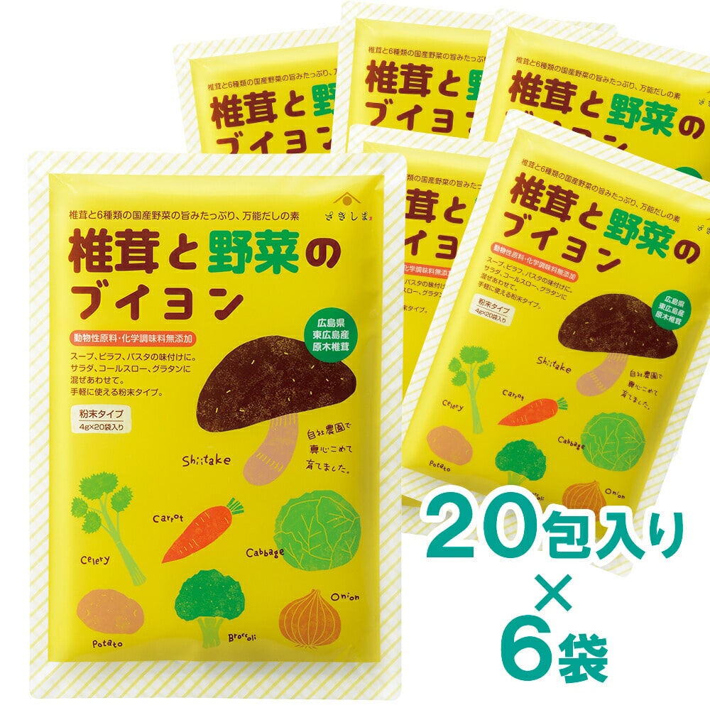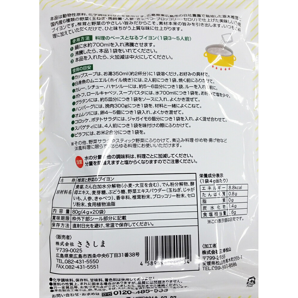 本品は動物性原料、化学調味料などを使用せず、広島県東広島市の自社農園で栽培した原木椎茸と国内産6種の野菜(玉ねぎ・馬鈴薯・人参・きゃべつ・ブロッコリー・セロリ)で仕上げた美味しい万能ブイヨンです。