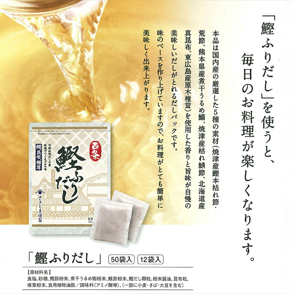 いつもの料理に加えていただくだけでひと味違う上質な味に仕上がります。内容量 【西条鰹ふりだし】8.8g×12包