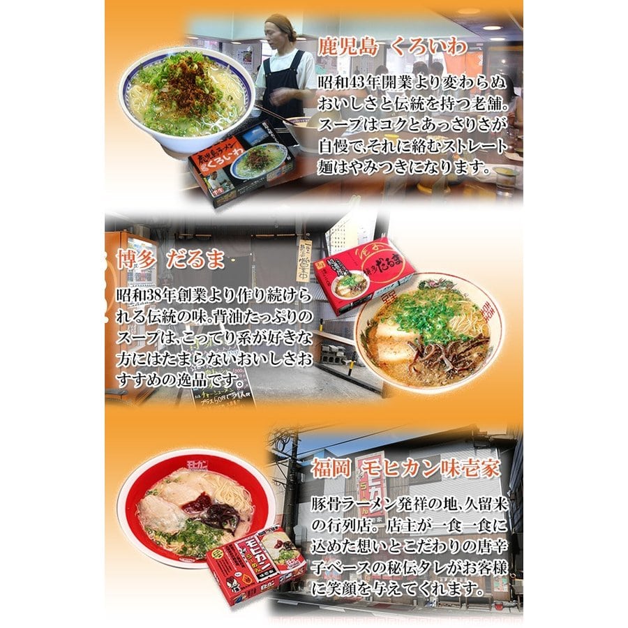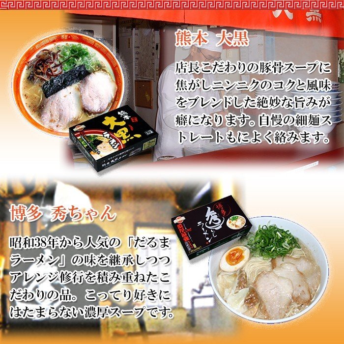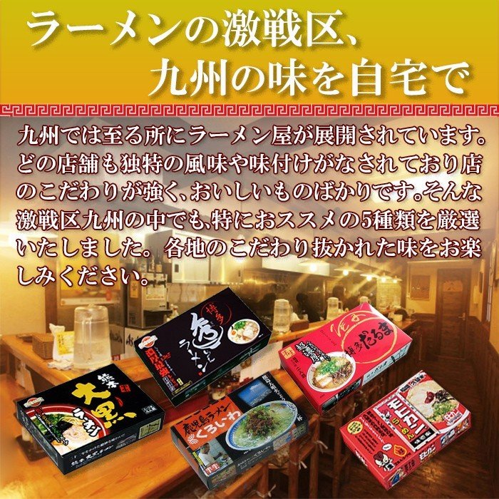 - 九州で大人気のラーメン屋5店舗の味を自宅で! 九州で有名で行列ができるようなラーメン屋の味が5種類集結しました。 各店舗ごとの並々ならぬこだわりをぜひご自宅でお楽しみください!