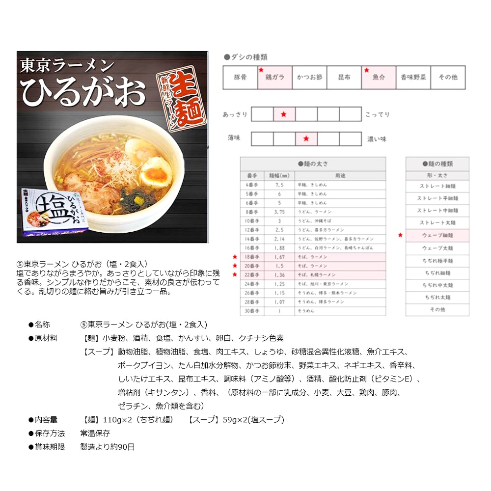 【東京ラーメン ひるがお(塩)】麺:110g×2(ちぢれ麺)、スープ:2袋