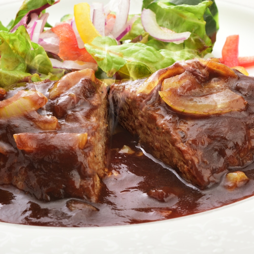 黄木が選び抜いた米沢牛と国産豚を使用したお肉の旨みをお楽しみいただけるハンバーグです。