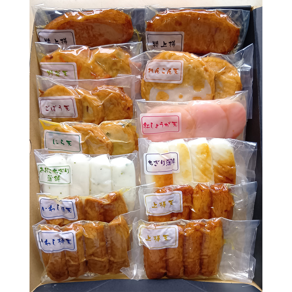 内容量 特上揚・ちぎり蒲鉾・あおさちぎり蒲鉾×各4個、上棒天・いわし棒天×各8個、にら天・ごぼう天・紅しょうが×各3個、野菜天・れんこん天×各2個 アレルゲン 小麦・卵・牛肉・大豆・ゼラチン 賞味期限 出荷日を含み冷蔵30日 保存方法 要冷蔵(10℃以下) ギフト対応について 完全包装可