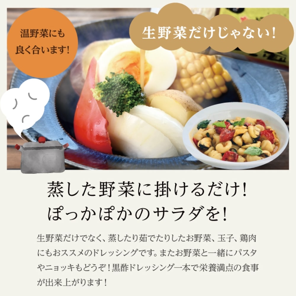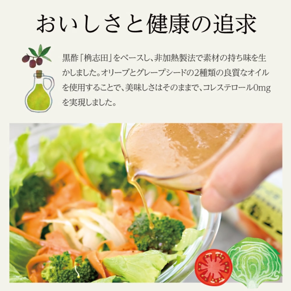 3年以上の長期熟成期間を経て造られた黒酢「桷志田」をベースにした黒酢ドレッシングです。