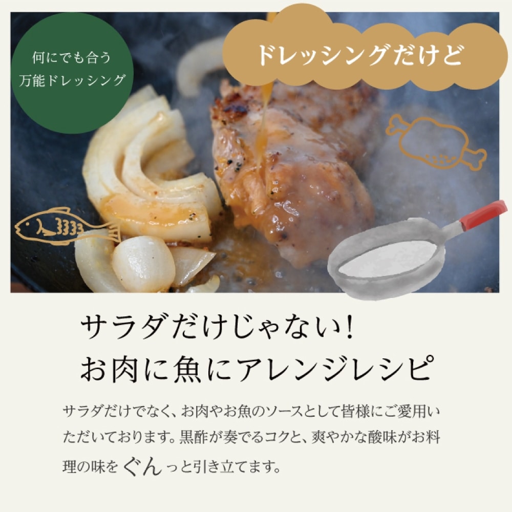 原材料:有機米黒酢(鹿児島県霧島市福山町産)、食用植物油脂(オリーブオイル・グレープシードオイル)、有機醤油(国産)、玉ねぎ(国産)、粗糖(国産)、塩、胡椒