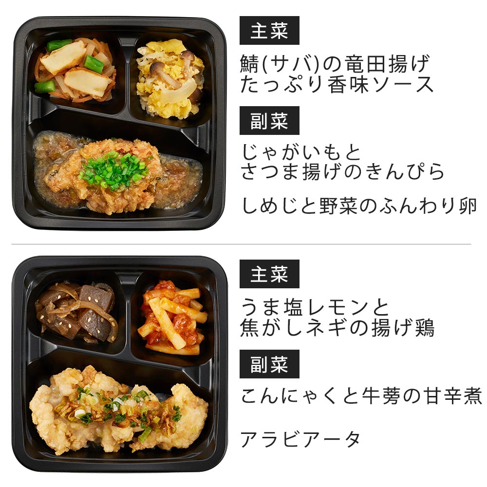 (鯖(サバ)の竜田揚げ たっぷり香味ソース107g・うま塩レモンと焦がしネギの揚げ鶏112g・食欲そそる鶏肉のカレーソース129g・白身魚の和風オニオンソース110g・濃厚トマトのハッシュドポーク130g・スタミナ韓国風炒め107g・関東風すき焼き139g・鶏唐揚げのレモン醤油127g・白身魚と根菜のチリソース炒め114g・そぼろと厚揚げとキャベツの中華炒め140g)アレルゲン 鯖(サバ)の竜田揚げ たっぷり香味ソース(卵・小麦・乳成分・さば・大豆・ごま・鶏肉)