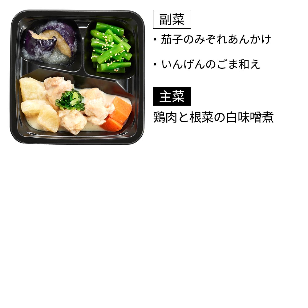 鶏肉と根菜の白味噌煮(エネルギー131kcal、たんぱく質8.6g、脂質7.6g、炭水化物7.1g、塩分1.5g)備考 配送方法:クール宅急便