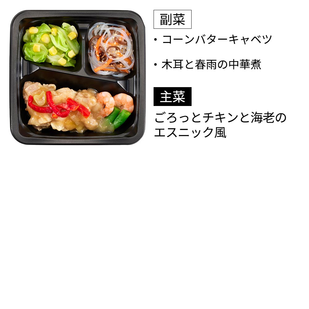 ごろっとチキンと海老のエスニック風(エネルギー139kcal、たんぱく質9.8g、脂質7.9g、炭水化物7.2g、塩分1.7g)備考 配送方法:クール宅急便