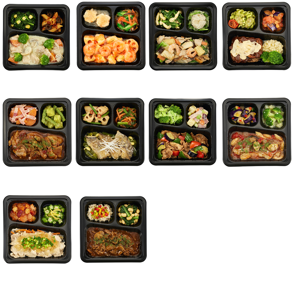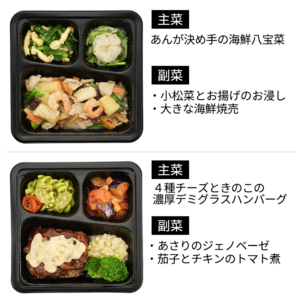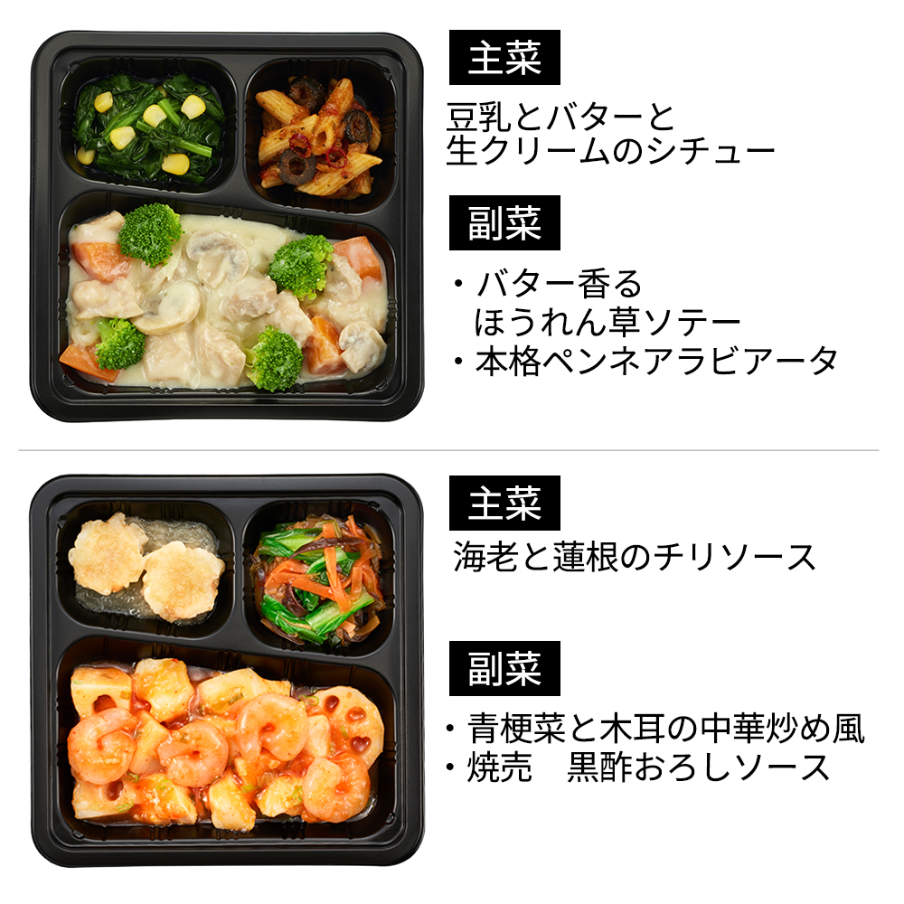(豆乳とバターと生クリームのシチュー255g・海老と蓮根のチリソース246g・あんが決め手の海鮮八宝菜259g・4種チーズときのこの濃厚デミグラスハンバーグ238g・チキンの赤ワイン煮228g・鱈(タラ)の香味中華ソース245g・豚肉と彩り野菜の味噌炒め風225g・魚介の旨味たっぷりアクアパッツァ225g・さっぱり豚しゃぶおろしポン酢241g・ハッシュドビーフ228g)アレルゲン 豆乳とバターと生クリームのシチュー(小麦・乳成分・大豆・鶏肉・豚肉)