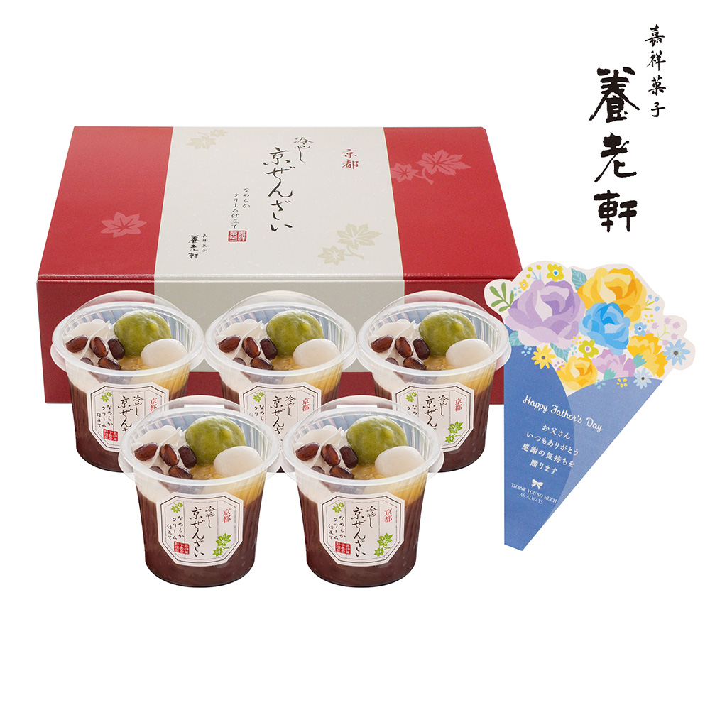 - 京の和心たっぷり『冷やしぜんざい』です。モンドセレクション金賞受賞の『あん』を使い、団子・栗あん・ホイップクリームを贅沢にトッピング。伝統の中にもモダンな風情を感じる、京都ならではの人気デザートです。父の日のメッセージをつけてお届けいたします。