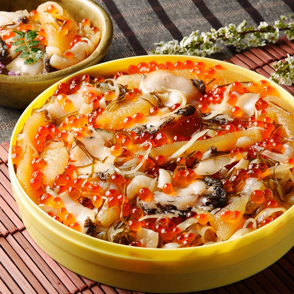 - 非常に貴重な蝦夷あわびと、いくらを使用した帆立松前漬です。