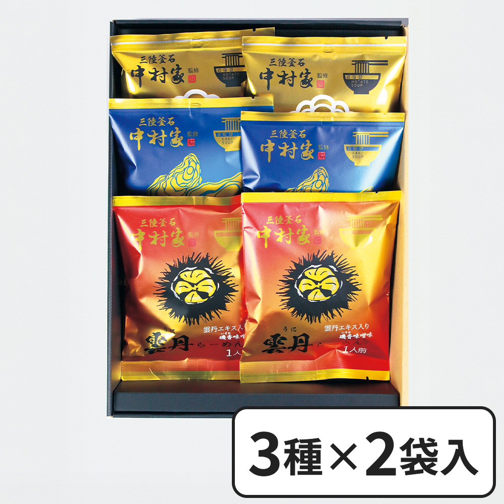 - 三陸釜石中村家監修のらーめんセットです。雲丹エキスを使用した味噌らーめん・牡蠣エキスを使用した醤油らーめん・帆立エキスを使用した塩らーめんの3種食べ比べが出来ます。