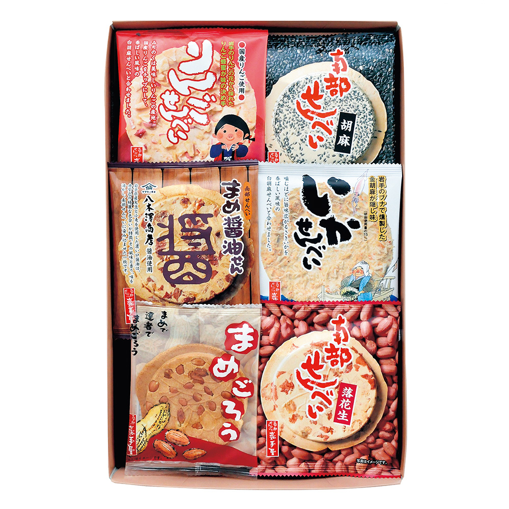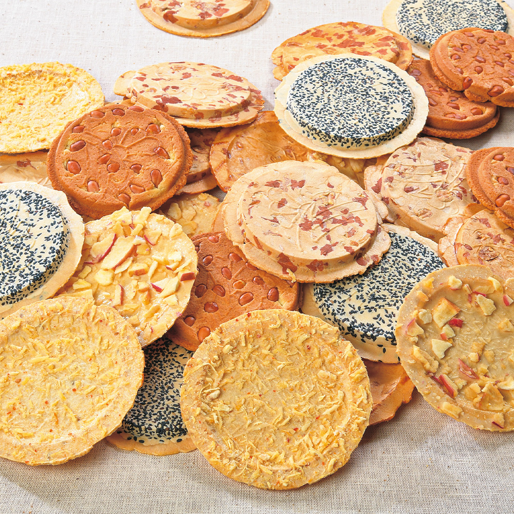 『腕自慢』は、胡麻、落花生、まめ醤油、まめごろう、いか、りんごの6種を詰合せています。内容 【胡麻】6枚、【落花生】6枚、【まめ醤油】5枚、【まめごろう】5枚、【いか】4枚、【りんご】4枚 原材料名 【胡麻】小麦粉(国内製造)、胡麻、でん粉、食塩/重曹、(一部に小麦・ごまを含む)