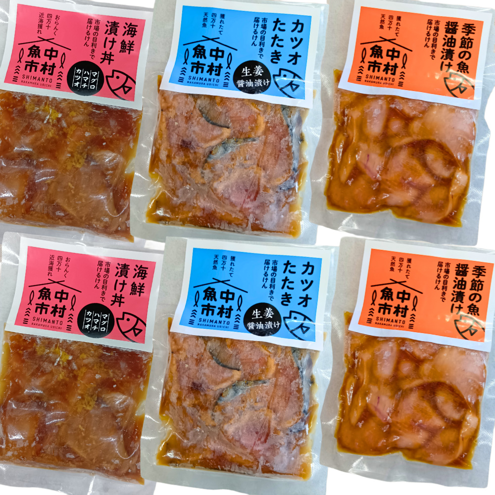 その時期にもっとも美味しい天然魚を厳選し、旬の味覚を醤油の旨みで引き立てています。どの魚が届くかはお楽しみ。四万十の季節を感じる一品です。内容量 漬け丼の具90グラム×2、カツオたたき生姜醤油漬け100グラム×2、季節の魚醤油漬け100グラム×2 原材料名 【日戻りカツオ、マグロ、ハマチ三種の海鮮漬け丼の具】