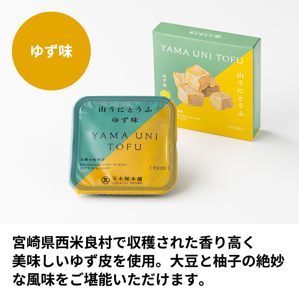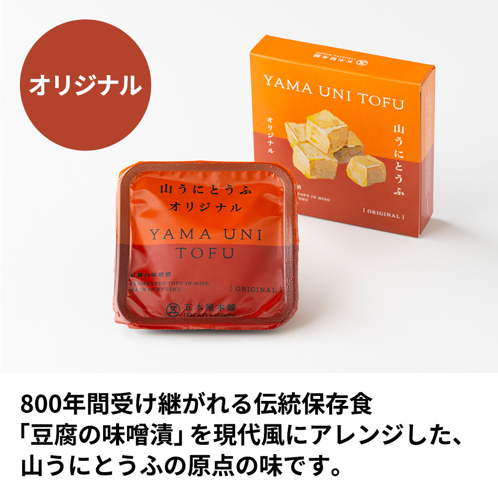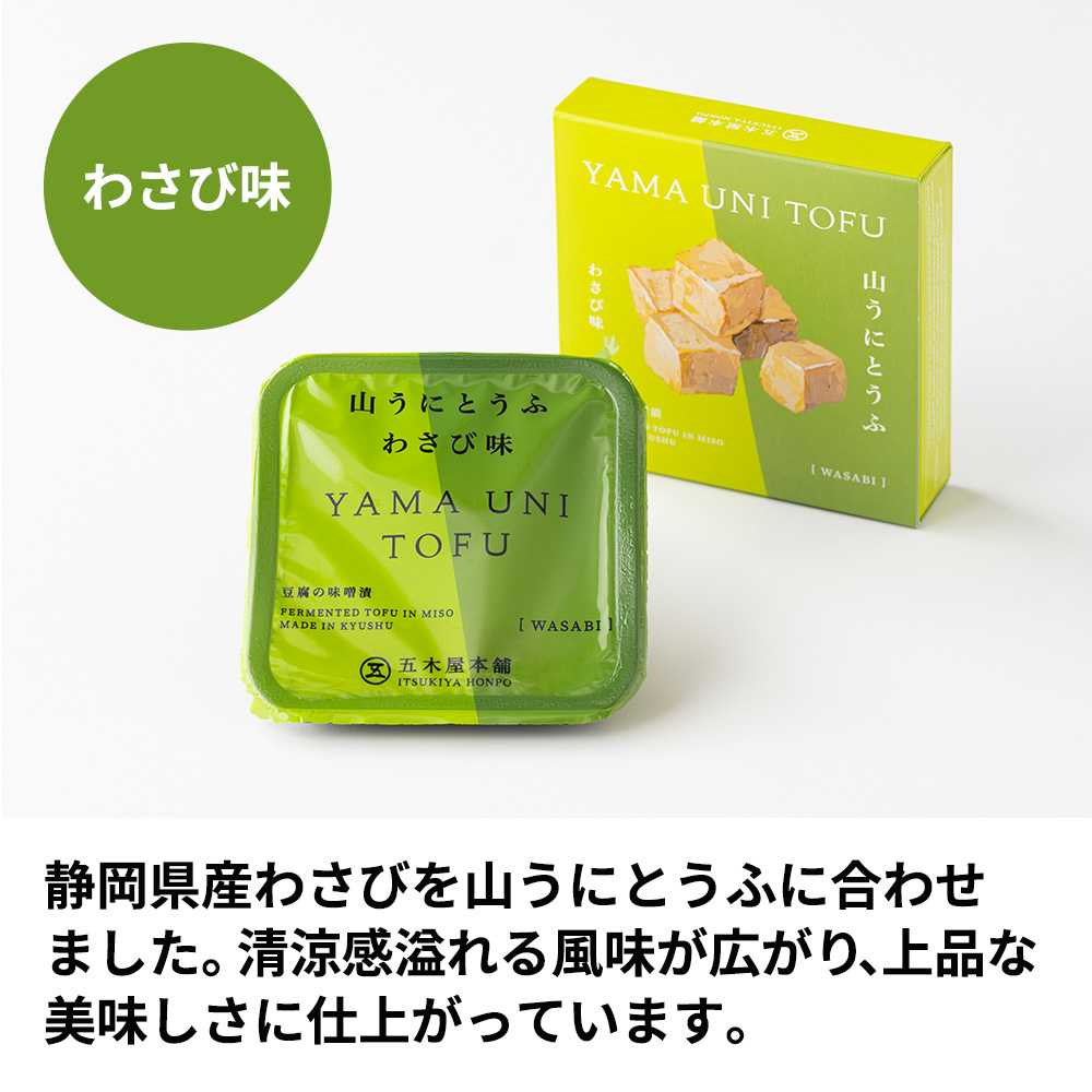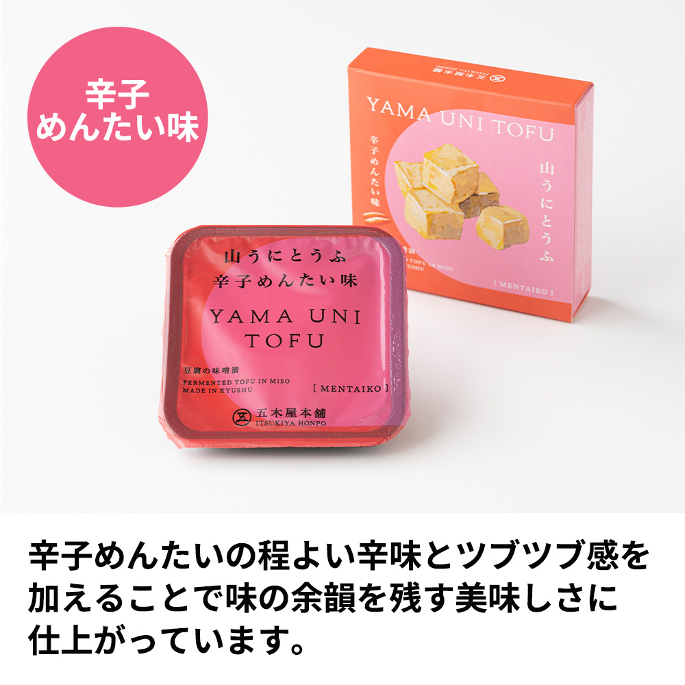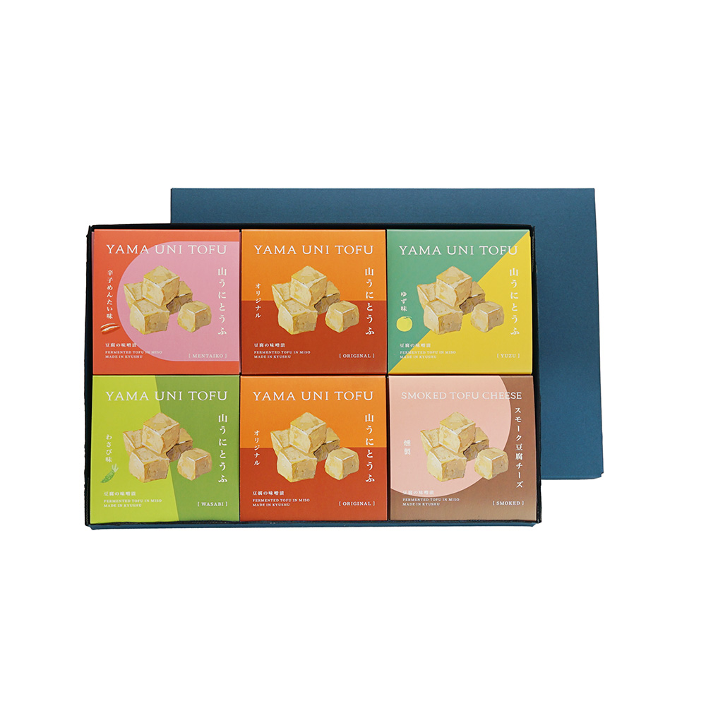 「かわべ」はオリジナルの山うに豆腐2個と辛子めんたい味、ゆず味、わさび味、スモーク豆腐チーズを各1個ずつの計6個セットです。内容量 【オリジナル・ゆず味】:50グラム【わさび味・辛子めんたい味・スモーク豆腐チーズ】:40グラム 原材料名 【オリジナル】豆腐(大豆〈九州産〉(遺伝子組み換えでない))、もろみみそ(大麦、砂糖・異性化液糖、大豆、食塩)/粗製海水塩化マグネシウム(にがり)