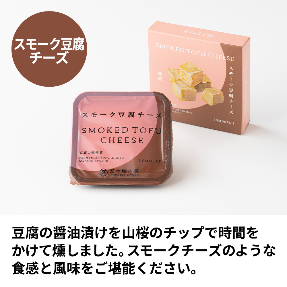 【スモーク豆腐チーズ】豆腐(大豆〈九州産〉(遺伝子組み換えでない))、もろみみそ(裸麦、盗塁〈砂糖・ブドウ糖加藤液糖〉、水飴、大豆、アミノ酸液、食塩)/粗製海水塩化マグネシウム(にがり)、ソルビトール、調味料(アミノ酸等)、甘味料(ステビア、甘草)、増粘剤(キサンタンガム)、ビタミンB2、(一部に大豆を含む)アレルゲン 大豆 保存方法 冷蔵10℃以下 賞味期限 製造日より冷蔵60日 ギフト対応について ギフト包装対応可(完全包装)