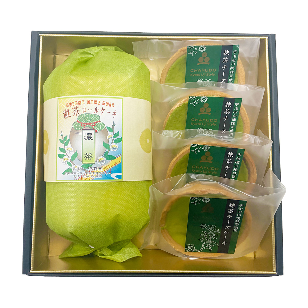 - 京都宇治にある抹茶スイーツの人気店「茶游堂」の看板商品「濃茶ロールケーキ」とタルト風の「抹茶チーズケーキ」のセットです。