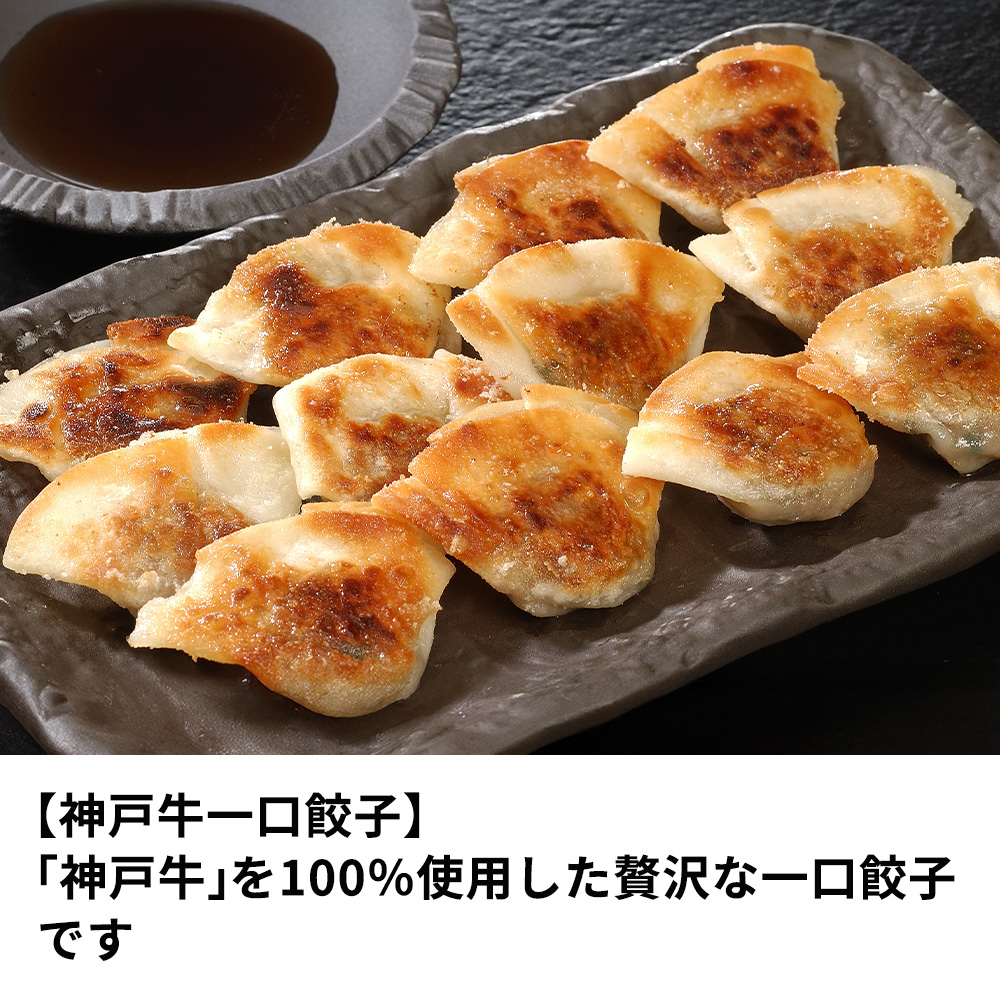 醤油、醸造酢、昆布だし、砂糖、食塩、ラー油/香辛料抽出物、(一部に小麦、大豆、ごまを含む)アレルゲン 【神戸牛一口餃子】