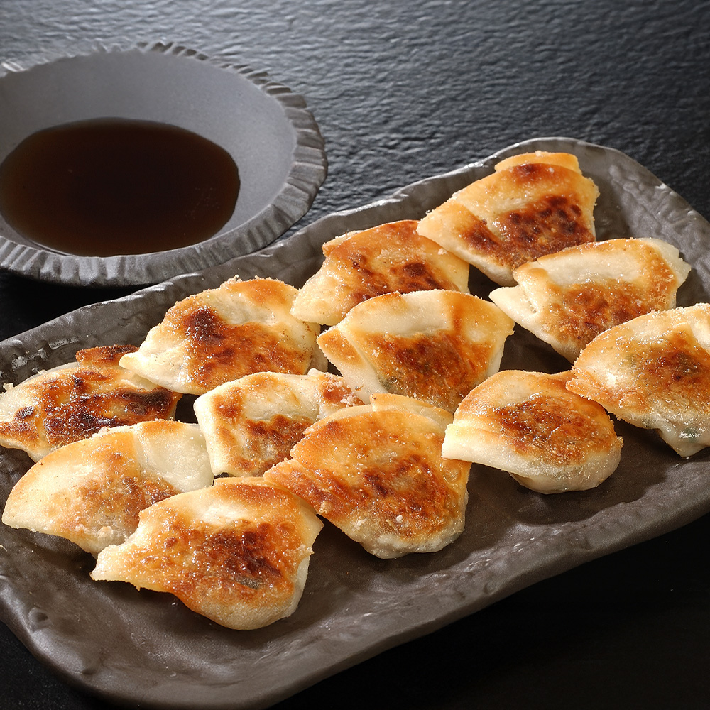 皮(小麦粉、植物油脂、食塩)(国内製造)、野菜(キャベツ(国産)、玉ねぎ、ニラ)、豚肉(鹿児島県産)、豚脂、しょうがペースト、にんにくペースト、醤油、オイスターソース、味付塩こしょう、ごま油、小麦粉、かつおだし/加工でん粉、酒精、調味料(アミノ酸等)、酸味料、増粘剤(加工でん粉)、着色料(カラメル)、(一部に小麦、大豆、豚肉、ごまを含む)