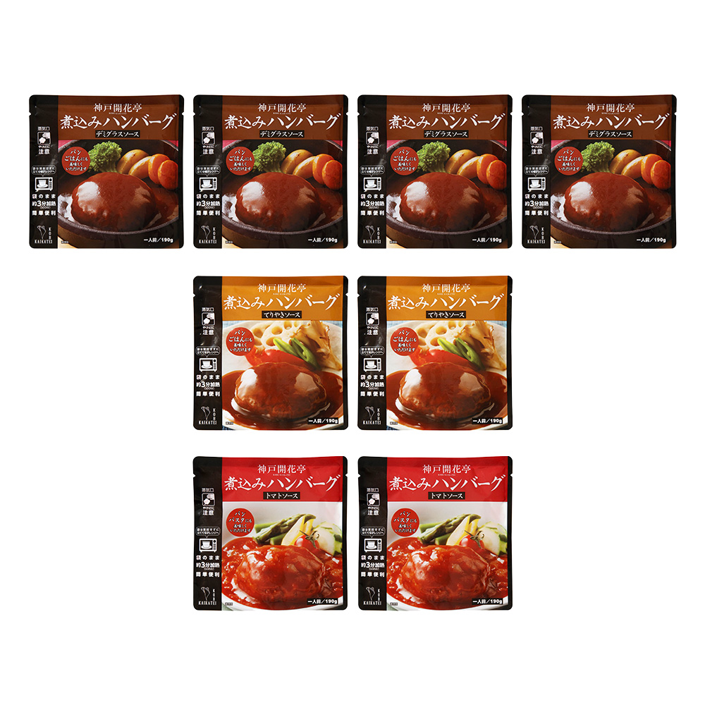 - 神戸の人気惣菜店「神戸開花亭」の人気商品「煮込みハンバーグ」デミグラスソースを始め、トマトソース、テリヤキソース3種類の味を楽しめるセットです。
