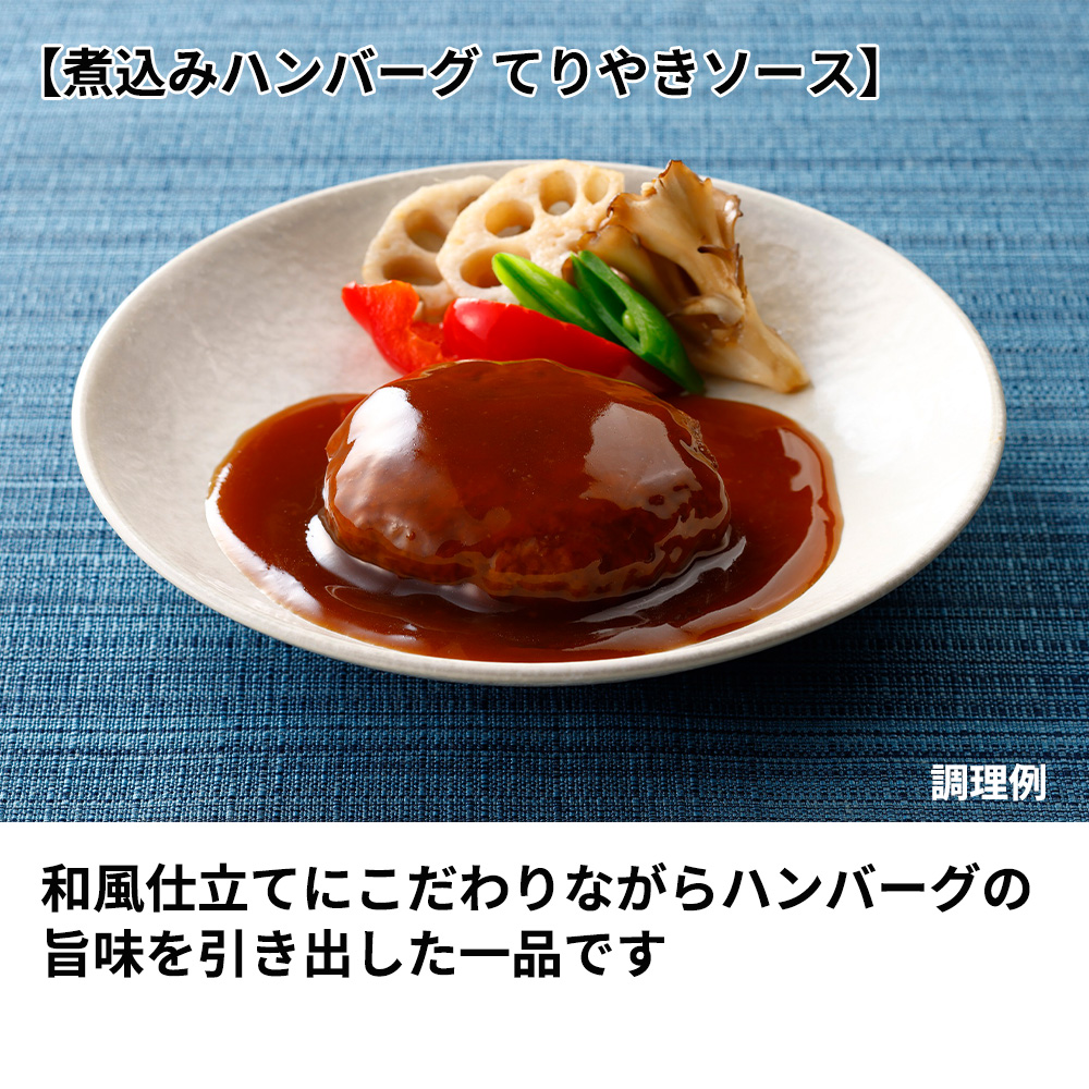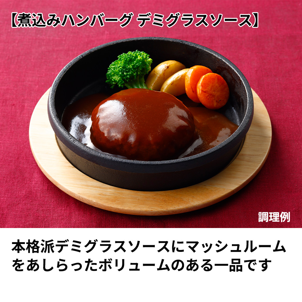 小豆島産の本醸造醤油の旨味と、蜜のようなまろやかな甘味が特徴の煮切り本味醂の絶妙なバランスによる和風仕立てにこだわりながらハンバーグの旨味を引き出した一品です。内容量 煮込みハンバーグ デミグラスソース:190グラム×4食