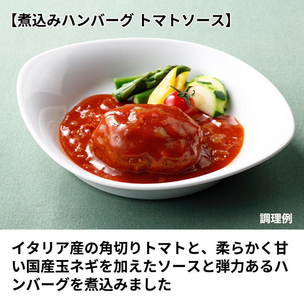 イタリア産の角切りトマトと、柔らかく甘い国産玉ネギを加えたソースに上質な粗挽き肉を使用し、肉汁がたっぷりの肉粒感を大切にしたジューシーでふんやりと弾力のあるハンバーグを煮込んだ一品です。
