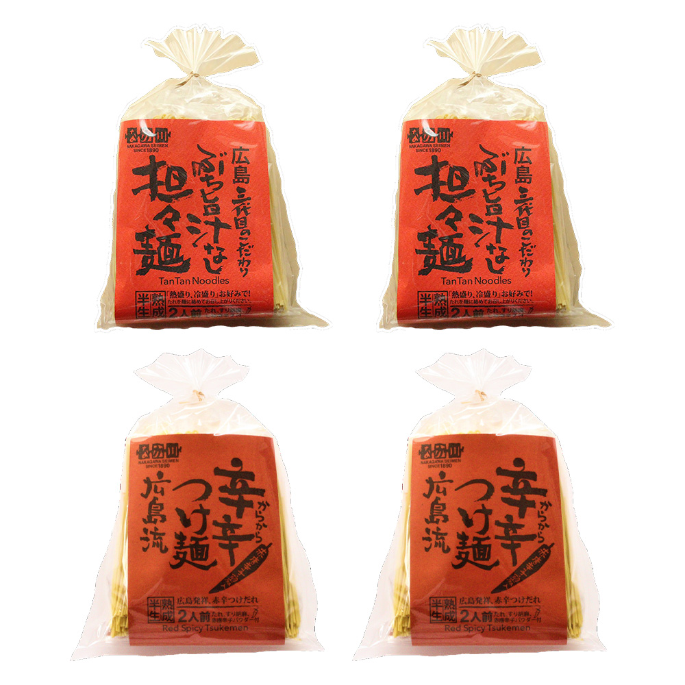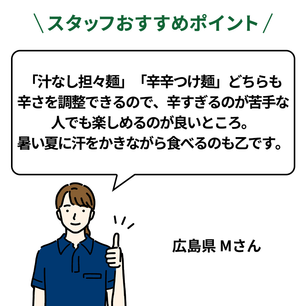- 広島のご当地麺として有名な「汁なし担々麺」と「広島つけ麺(辛辛つけ麺)」をセットにしました。