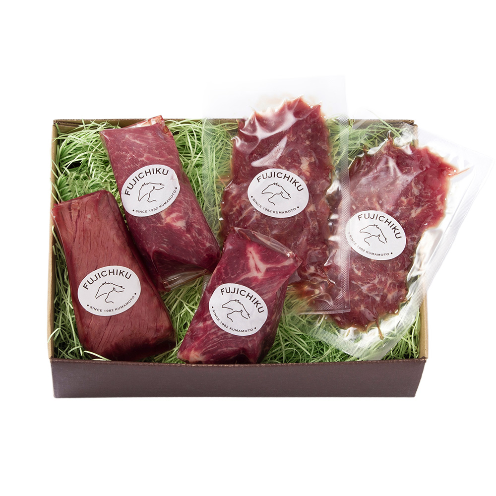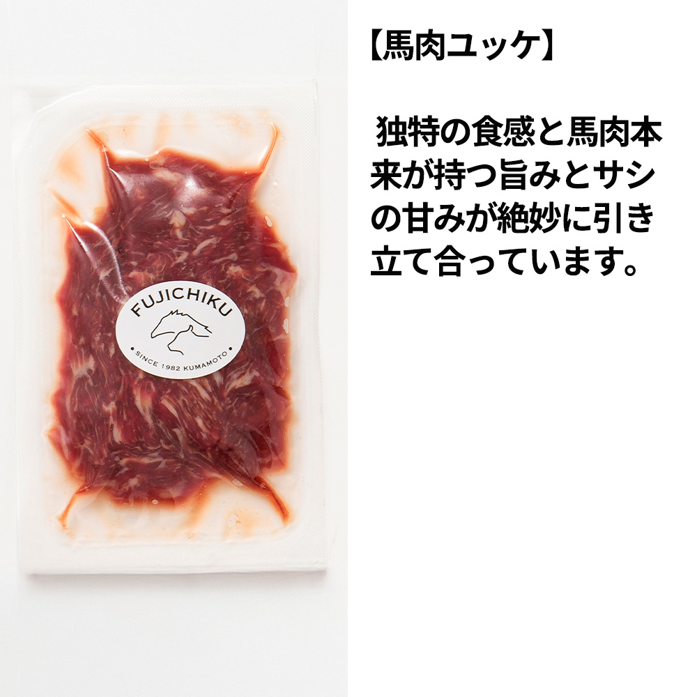 解凍するだけでお召し上がりいただける「ユッケ」独特の食感と馬肉本来が持つ旨みとサシの甘みが絶妙に引き立て合っています。内容量 馬刺しロース・上赤身・たたき 各80g、ユッケ50g×2 原材料名 【馬刺しロース・上赤身・たたき・ユッケ】馬肉(カナダ産熊本肥育またはフランス産熊本肥育・国産(重種馬))