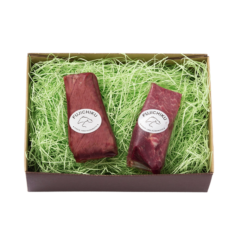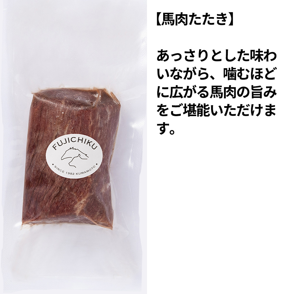 - 馬刺しの人気部位「上赤身」と馬肉たたきの食べ比べができるセット。