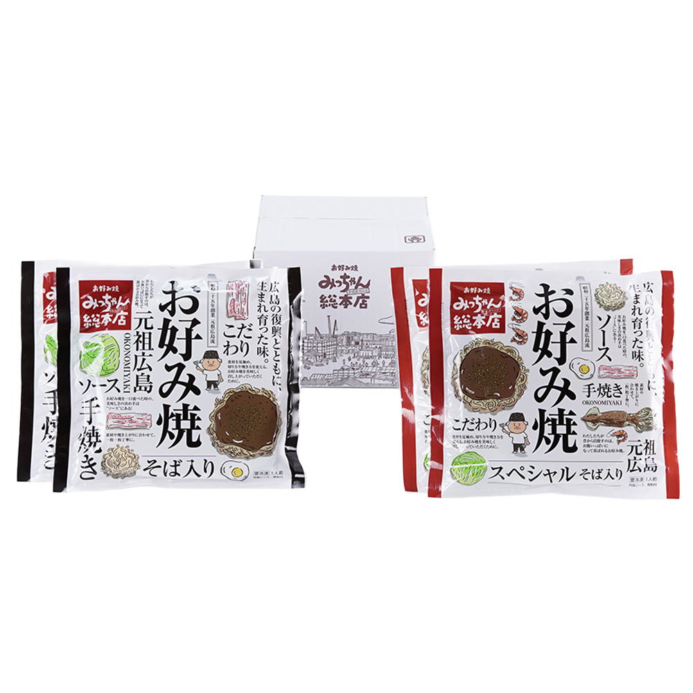 広島流お好み焼の定番メニュー「そば入」と、店舗でも人気の「スペシャル(いか・えび入)」を各2枚ずつセットにしました。