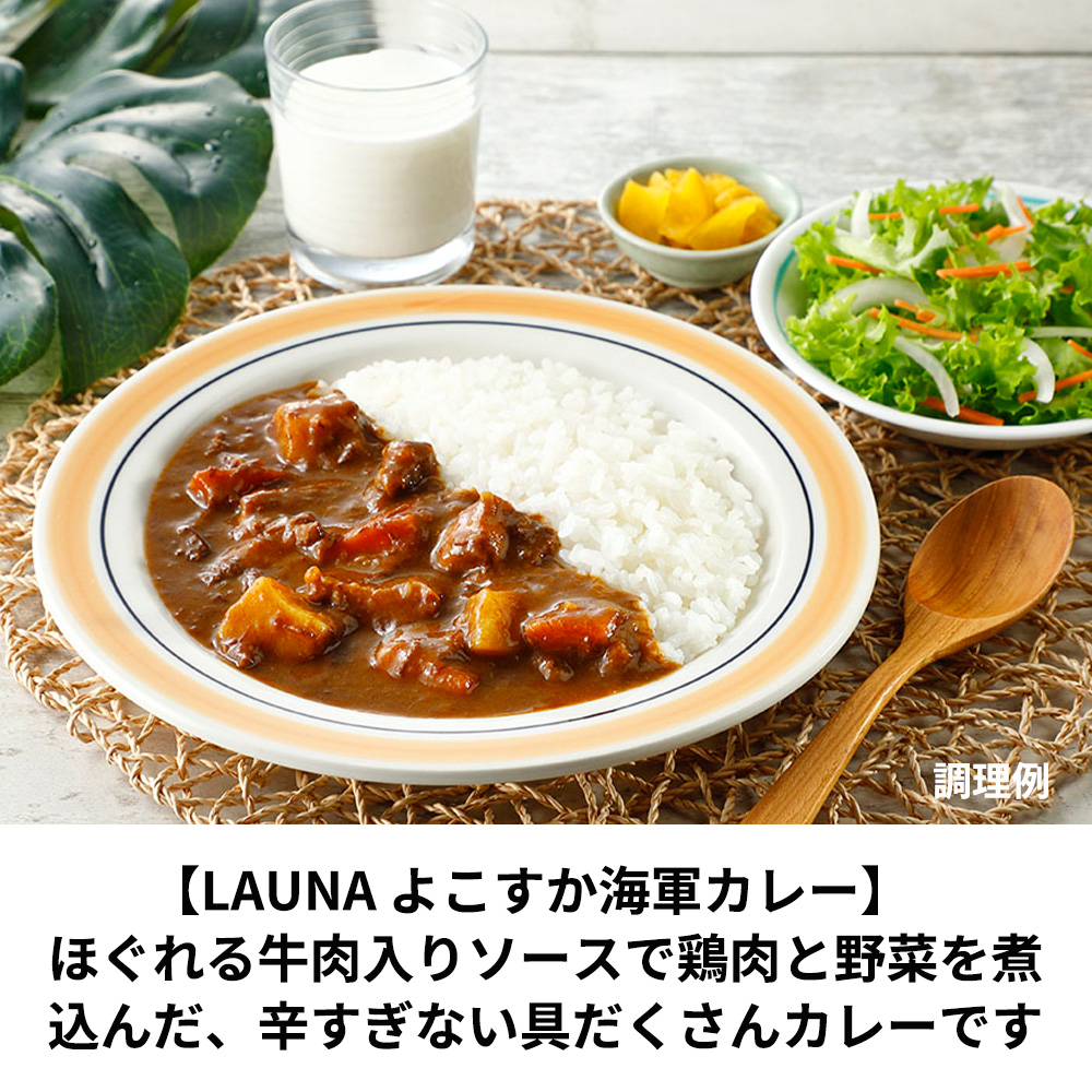 【LAUNA よこすか海軍カレー】野菜(にんじん、じゃがいも、玉ねぎ)、食肉(鶏肉、牛肉)、牛脂豚脂混合油、チャツネ、にんじんペースト、りんごペースト、カレールウ、ビーフエキス、小麦粉、カレーパウダー、でんぷん、食塩、トマトペースト、ガーリックペースト、しょうがペースト、バナナペースト、砂糖、香辛料、酵母エキス/調味料(アミノ酸等)、カラメル色素、酸味料、乳化剤、香辛料抽出物、香料、(一部に乳成分、小麦・牛肉・ごま・大豆・バナナ・豚肉・鶏肉・りんご・ゼラチンを含む)