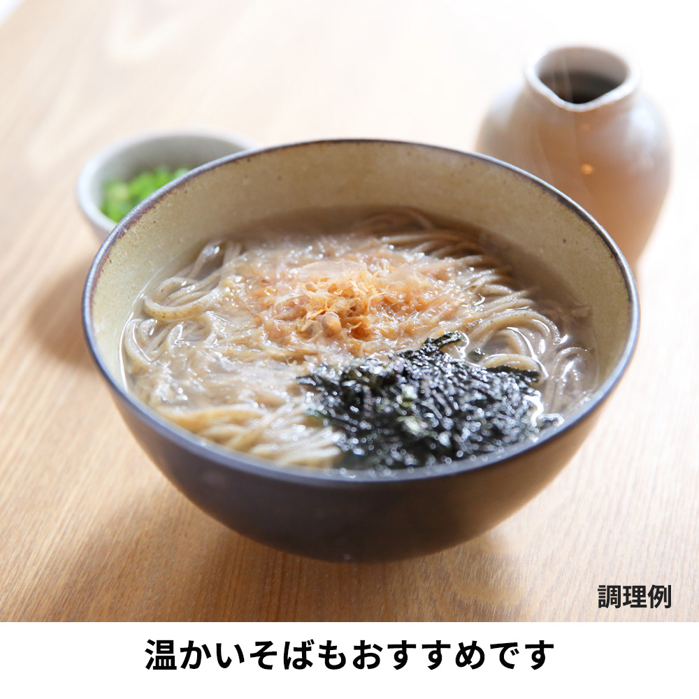 - つなぎを使わず独自製法で仕上げたそば粉を100%使用したなめらかで風味の良い十割そばです。