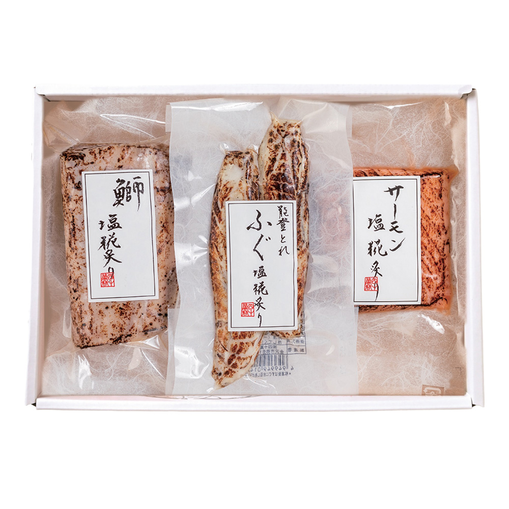 - 鰤 塩糀炙り、ふぐ塩糀炙り、サーモン塩糀炙りのセットです。