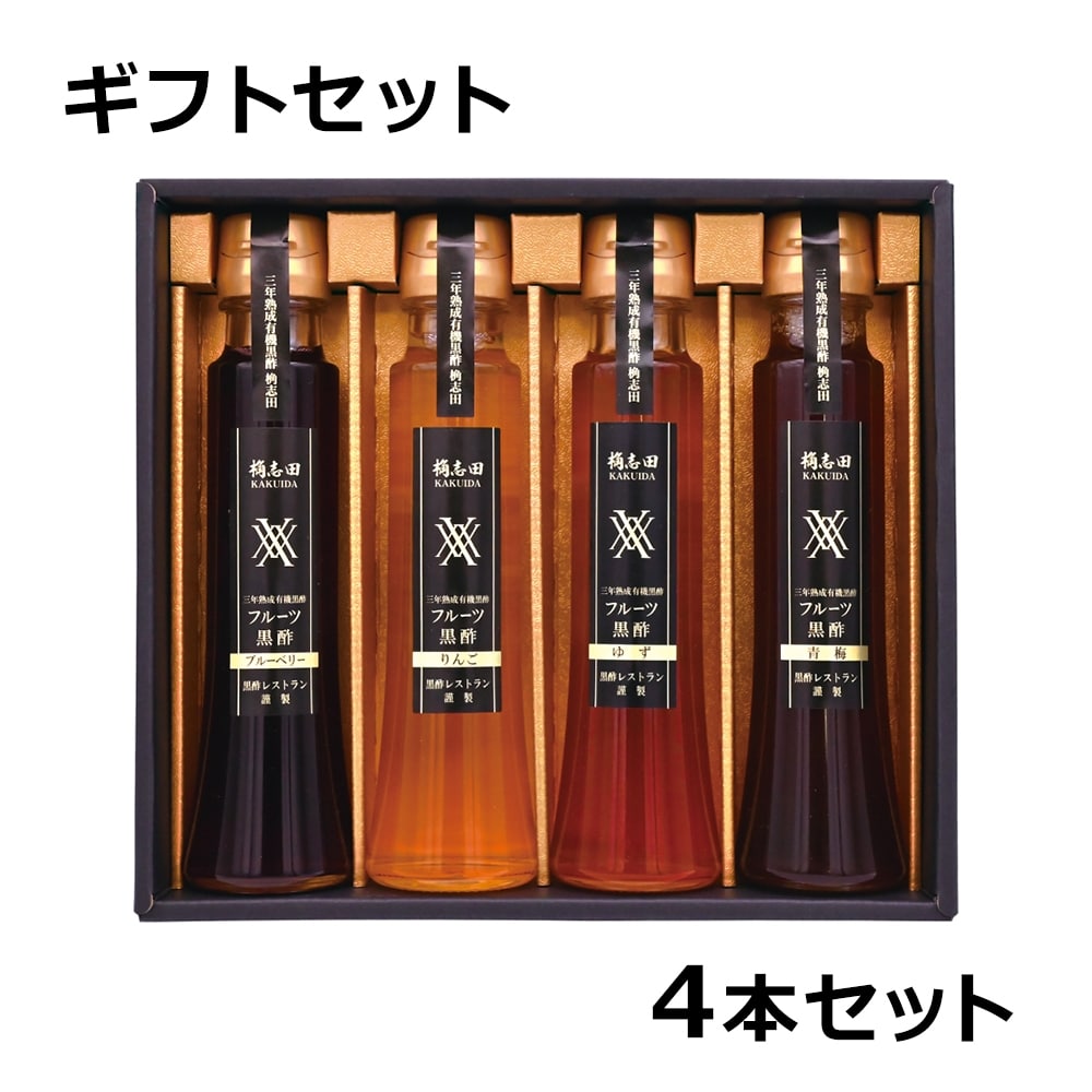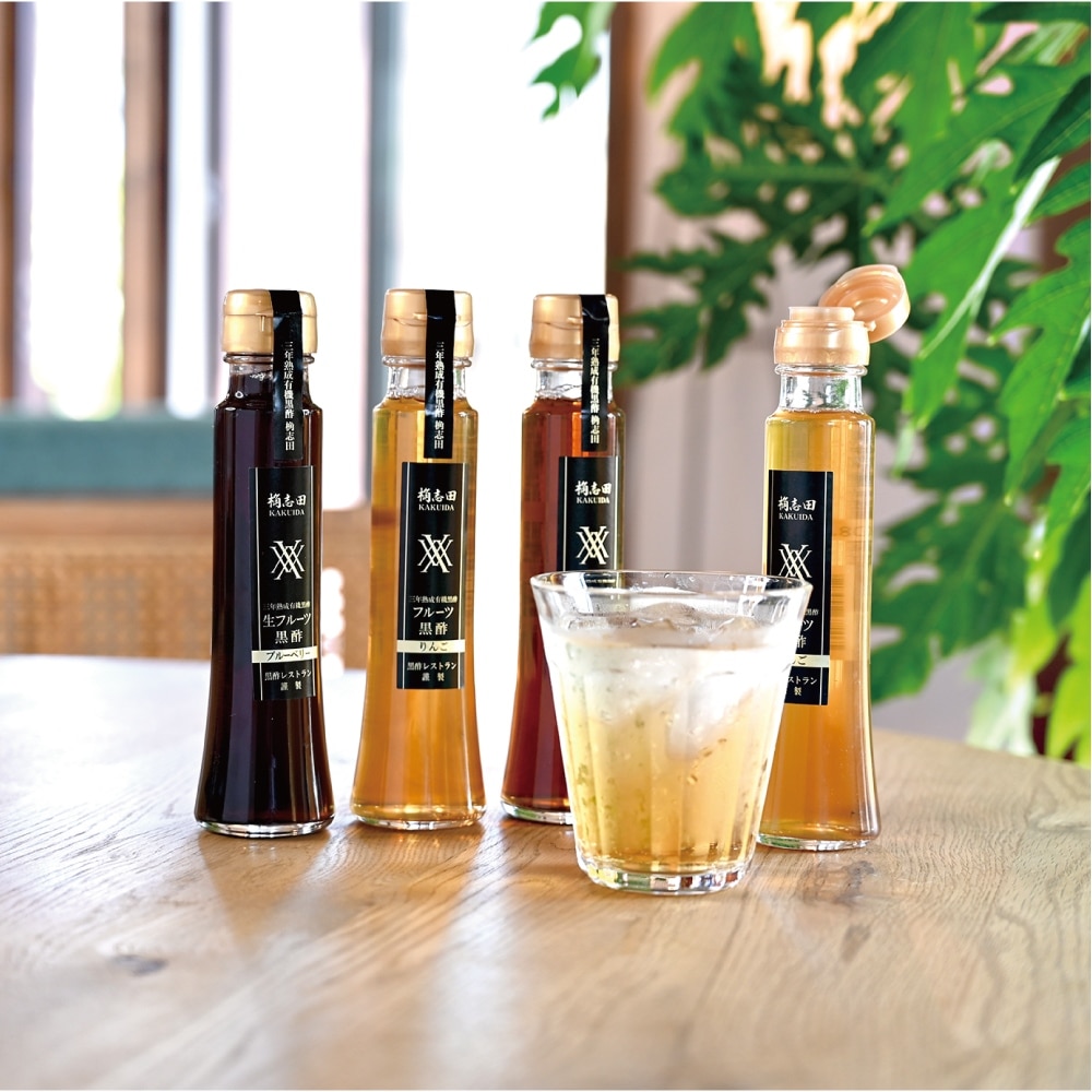- 有機3年熟成黒酢「桷志田」に、人気の果実を丸ごと漬け込んだ、生フルーツ黒酢の飲み比べセットです。