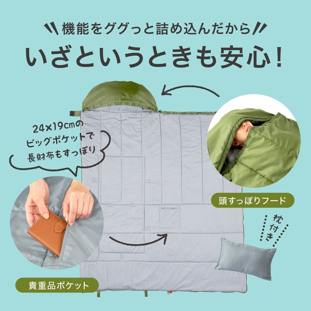 シンプルかつ、様々な用途に使え、防災時に必要な機能を網羅した寝袋。