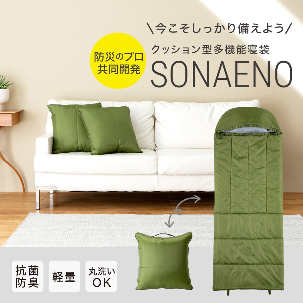 その寝袋を普段使いもできるクッション型収納にして、防災をもっと身近に、そして実際の被災で必要になる機能をしっかり詰め込み、これまでの寝袋よりもっと高次元な安心をお届けする防災寝袋。それが「SONAENO クッション型多機能寝袋」です。