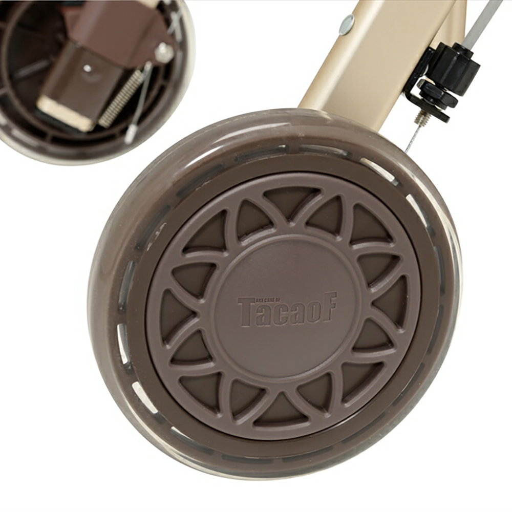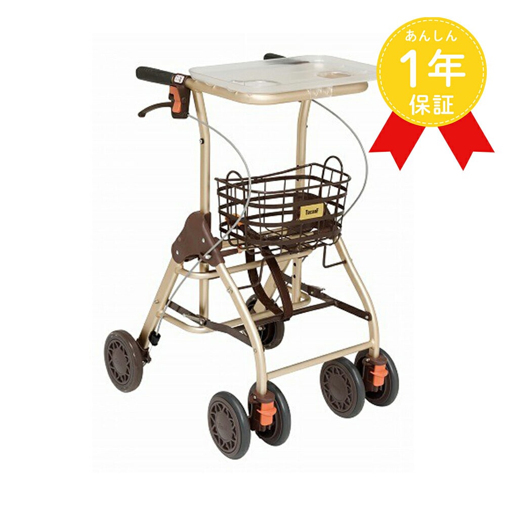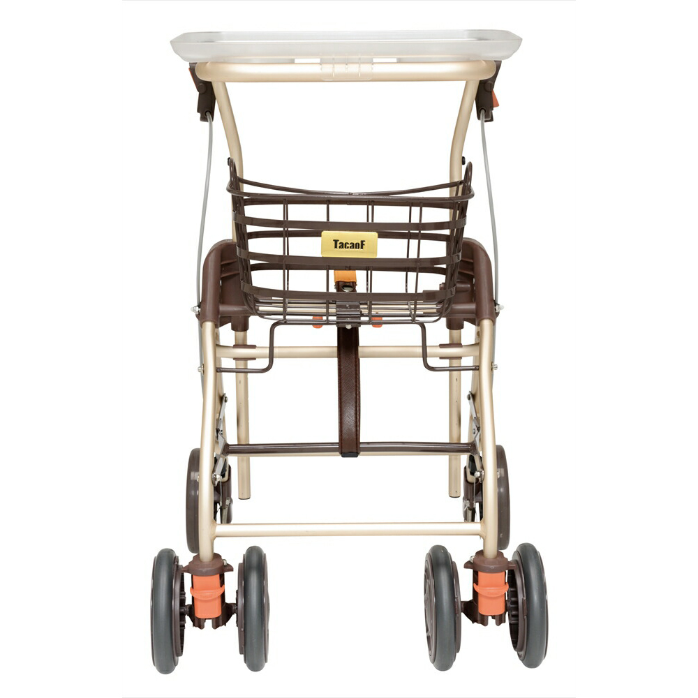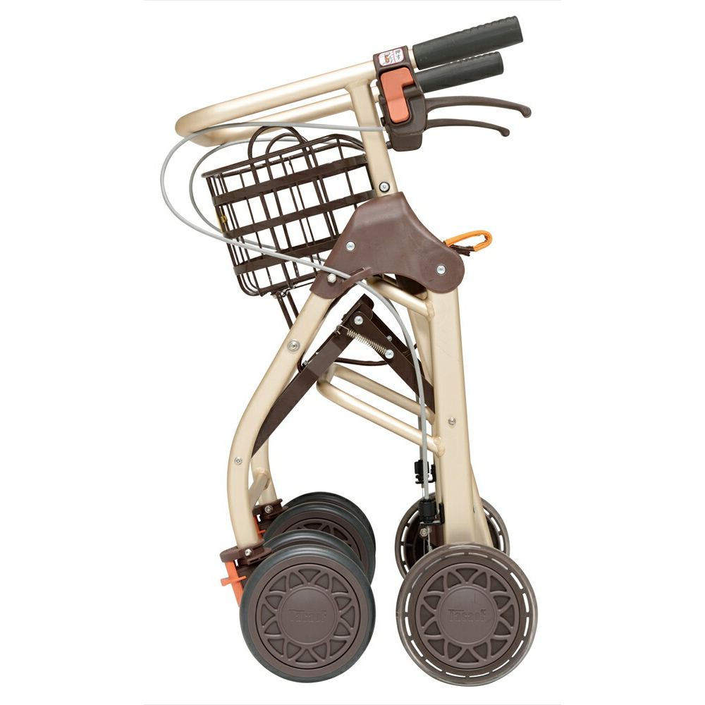 - 屋内での移動に便利なコンパクト設計、フローリングでも滑りにくいタイヤの歩行車。