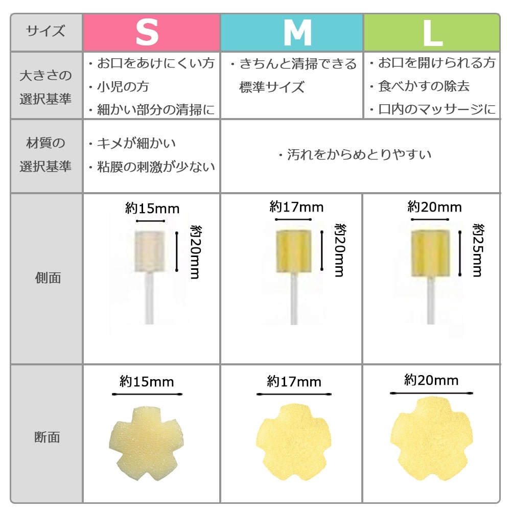 - ご使用者の口腔状態によって選べるスポンジサイズ3種類(S/M/L)