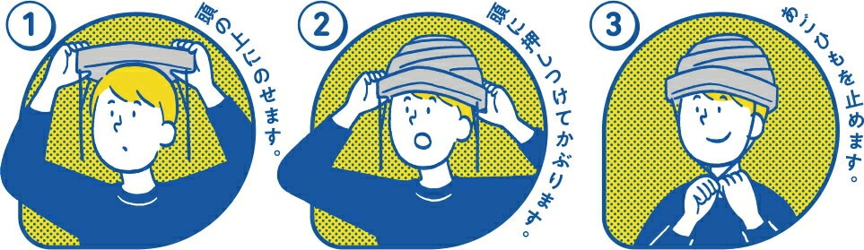 ●頭の上にのせてそのまま押しつけ、あごひもを止めれば装着完了。約3秒で頭を守ることができます。