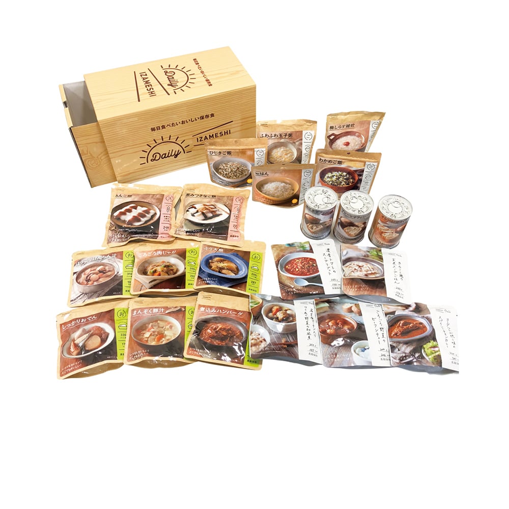 - 「デイリーイザメシ」は1人3日分の保存食セット。
