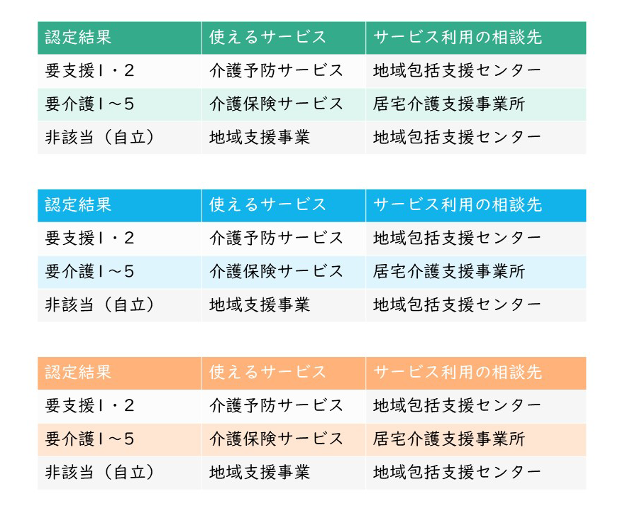 介護を必要としていない状態だと判断された場合は「非該当(自立)」と認定されます。 ただ、「非該当(自立)」と認定されても、実際は部分的な生活に支援が必要だったり、閉じこもりがちだったりで、要介護状態に陥るリスクのある方もいます。 市区町村では、そのような方を対象に「介護予防・日常生活支援事業(総合事業)」などを介護予防の観点から展開しており、サービスを利用することができます。相談は市区町村の窓口、もしくは地域包括支援センターとなります。