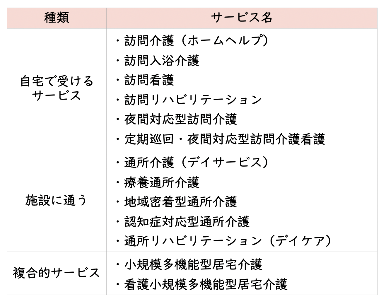 要介護認定を受けた後も在宅生活を継続する方に提供するサービスが「居宅サービス」です。 居宅サービスには「自宅で受ける」「施設に通う」あるいは「宿泊、通い、自宅で受ける」が複合的に利用できるサービスなどがあります。