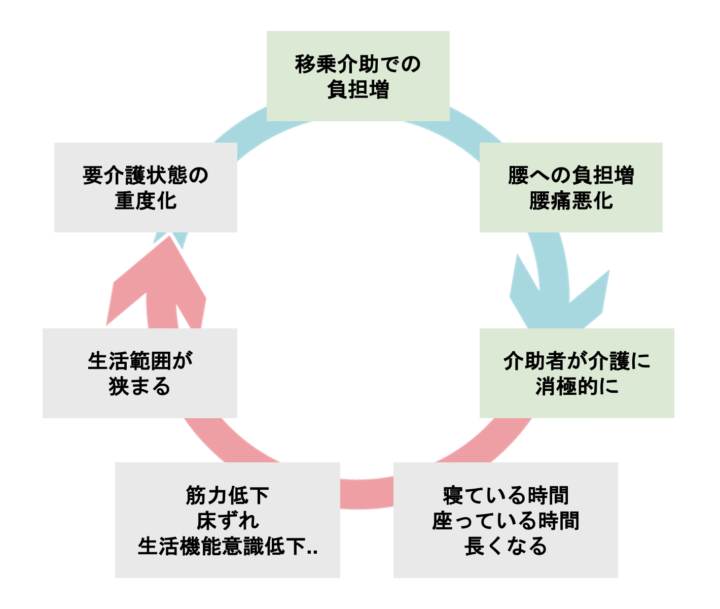 移乗介助において、怖いのはそれだけではありません。介助者の身体的負担が高まれば、移乗介助に対して消極的になってしまい、被介護者が椅子に座っている時間、ベッド上で過ごす時間がどんどん長くなってしまい、図1のような負のサイクルを引き起こす危険があります。