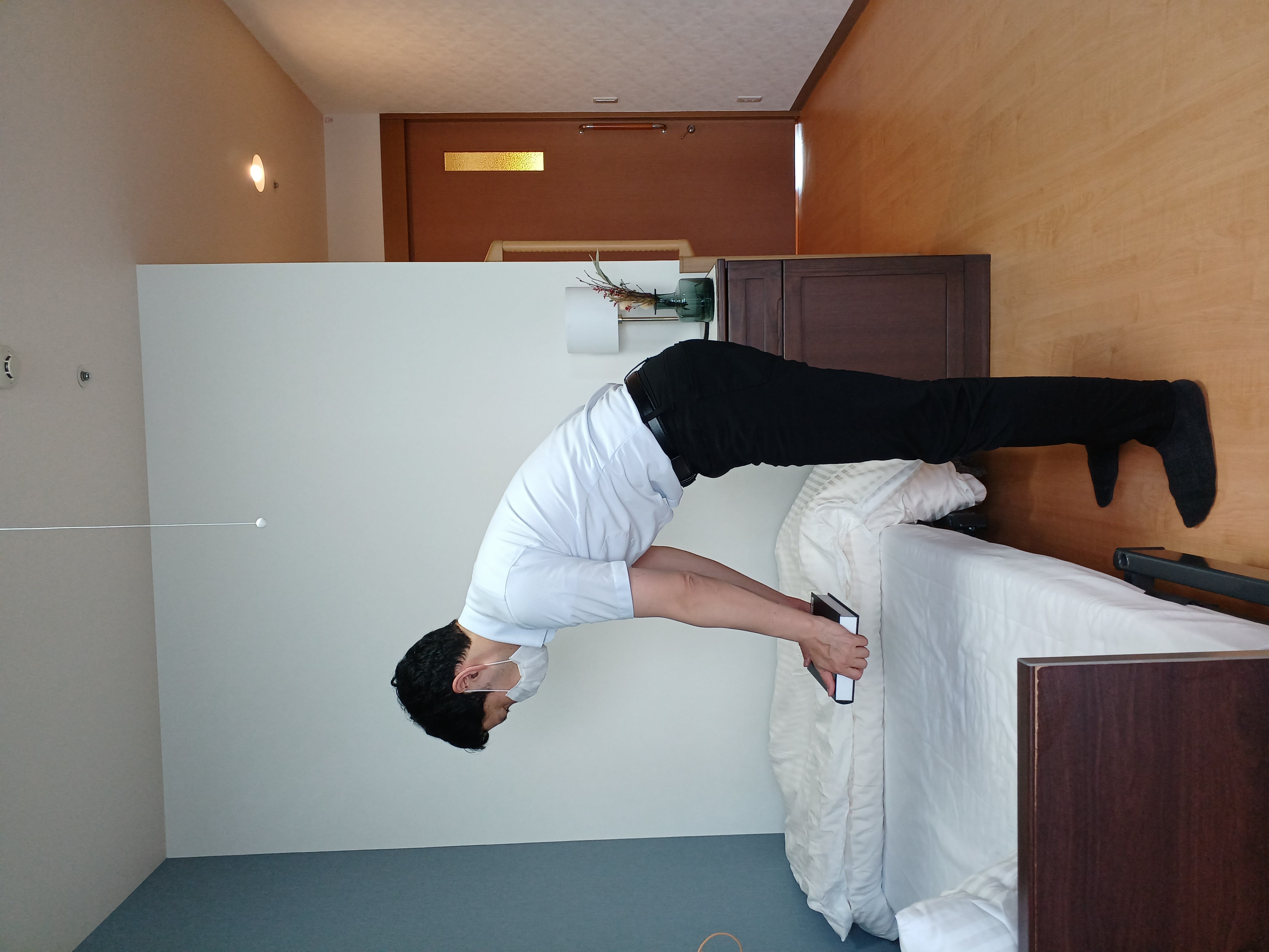 以下の写真⑥のように、高さ調整を行うリモコンがついたベッドも介護保険のレンタル対象商品ですので、まだ使用していない場合は一度担当のケアマネージャーに相談してみてください。- 写真④:ベッドから車いすへ移乗する場面