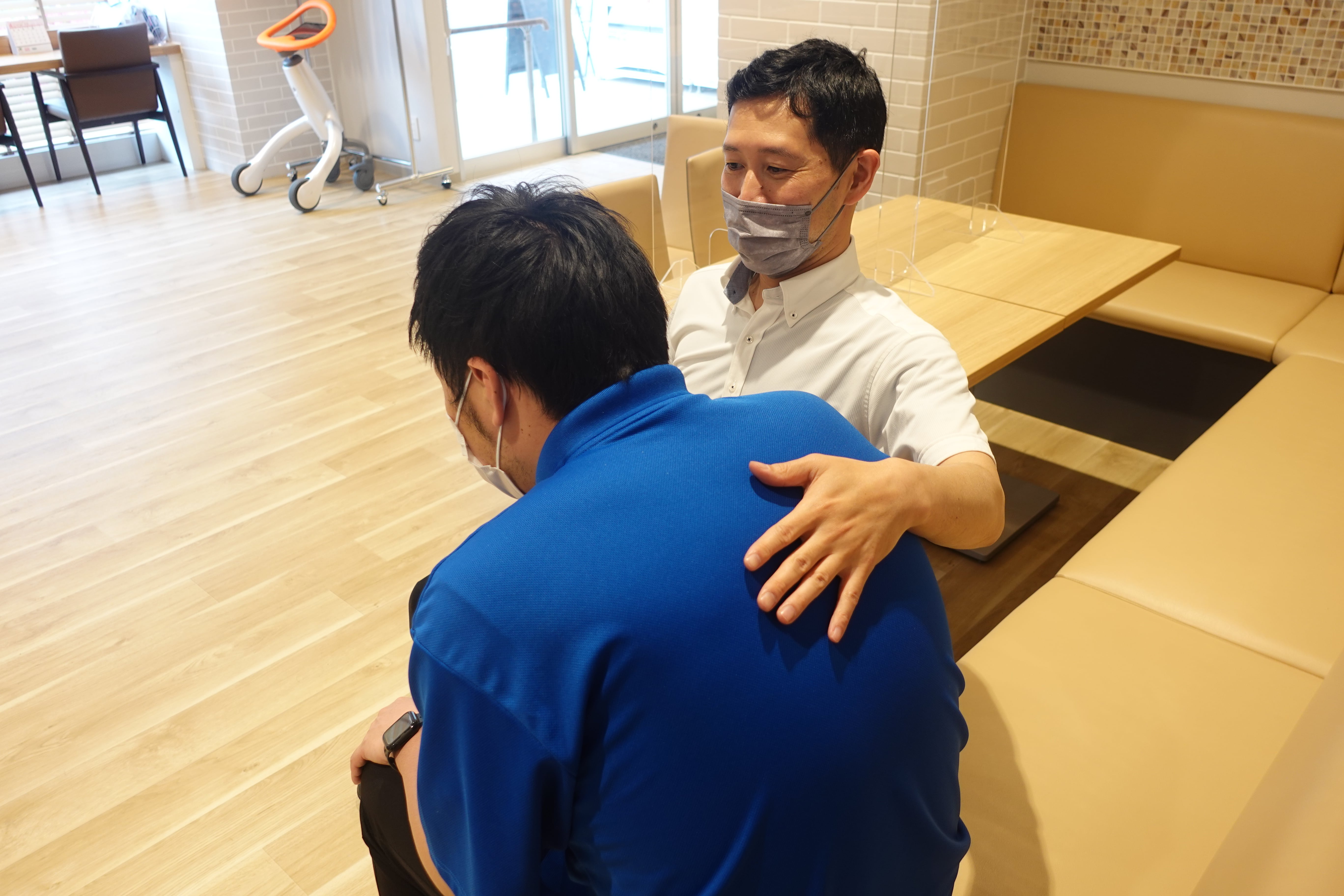 両手で支えないと座っていられない場合は、移乗介助の際に介助者1人にかかる負担がかなり増します。この場合は、介助者2人で移乗介助することをおすすめします。- 写真②:一部介助で支える