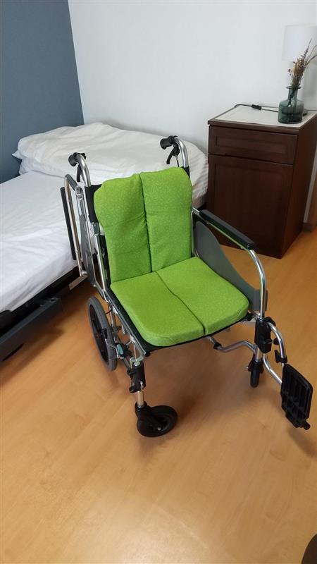 写真を見ていただくとわかる通り、車いすの片側の肘置き(アームレスト)、足置き(フットレスト)を外せる車いすを使うことになります。-